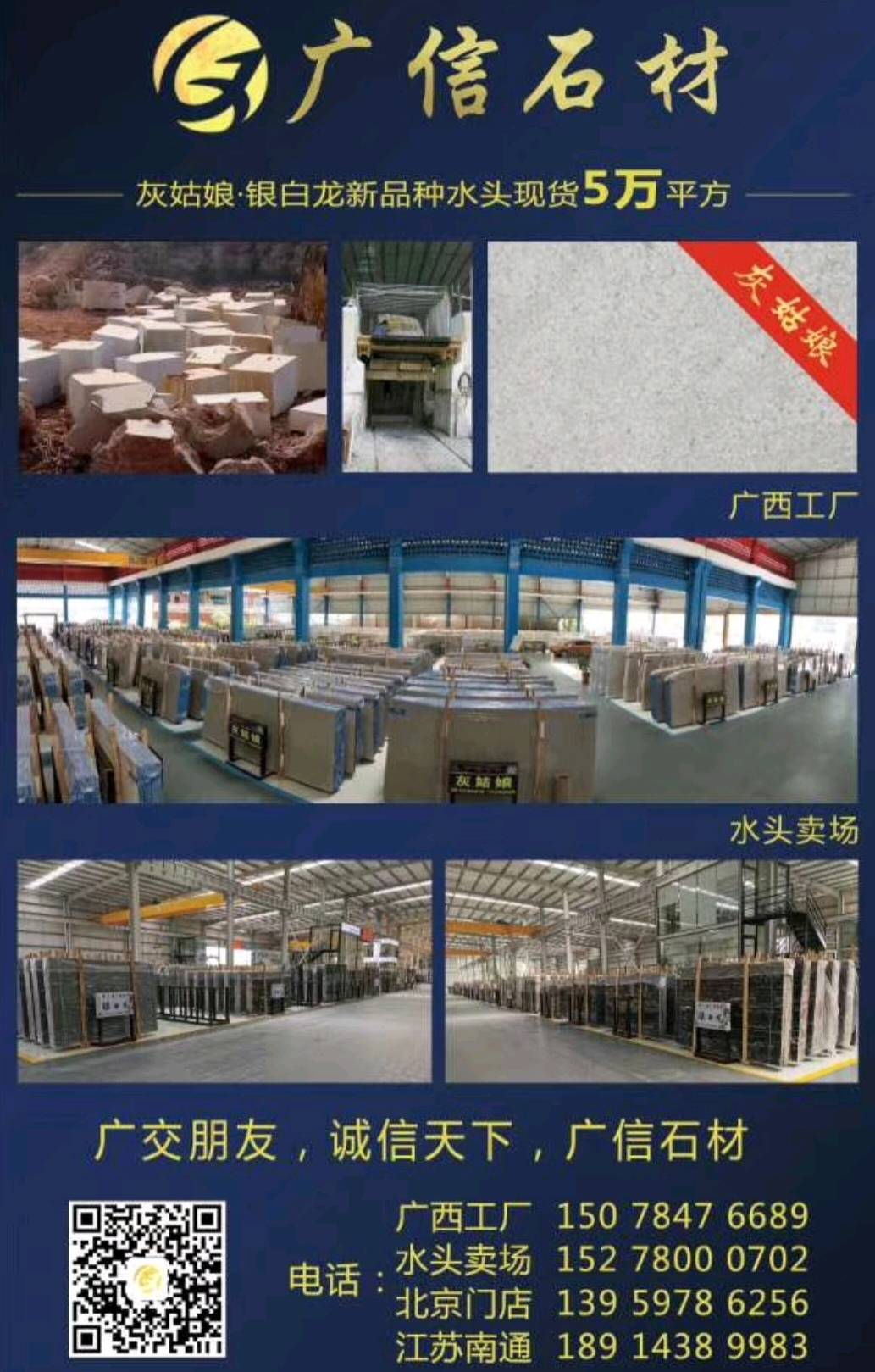 廣信石材有限公司是一家集開采生產(chǎn),加工,銷售于一體的民營企業(yè),主要經(jīng)營天然大理石:灰姑娘,地中?;遥ù蟀澹瑮l板,規(guī)格板),雅士灰,銀白龍,小米灰,美尼斯灰,新古堡灰,南極灰等各類天然大理石石材。主要銷往以色列,歐美,韓國以及國內(nèi)工程。礦山廠家直銷,廣西工廠,福建水頭,河北香河,江蘇南通均有銷售點,歡迎您來我們直銷店或則廣西工廠實地考察參觀選購。