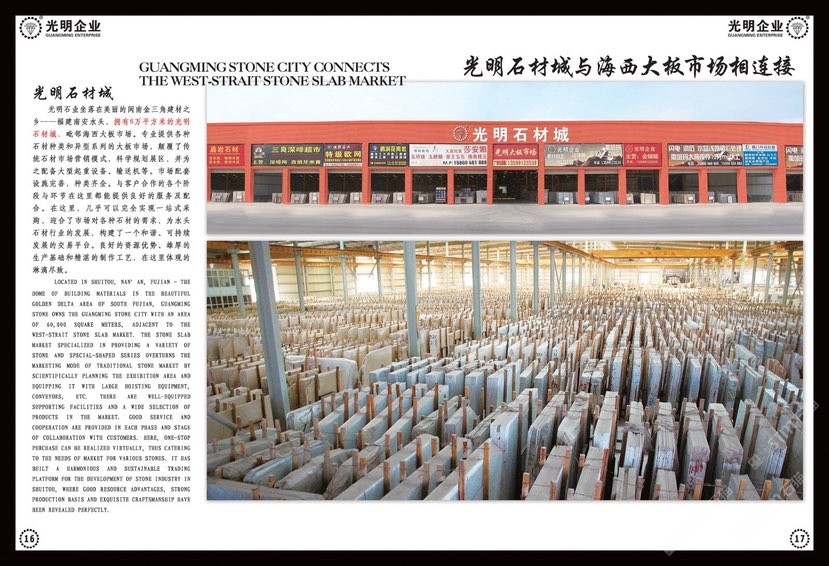 光明石業(yè)創(chuàng)建于1991年,歷經(jīng)二十多年發(fā)展投資,現(xiàn)已成為集金剛石刀具、礦山開采、多品類石材生產(chǎn)加工、大型工程承接、石材產(chǎn)業(yè)鏈生態(tài)平臺為一體的多元化、跨地域大型石材集團,總注冊資金近2億元,占地幾十萬平方,員工上千人,是中國石材行業(yè)經(jīng)營規(guī)模、加工水平、綜合實力強的企業(yè)之一。旗下?lián)碛卸嗉易庸?,包括南通新光明石業(yè)發(fā)展有限公司、錦明石業(yè)有限公司、新疆光明礦業(yè)、光明石材城。\\\\\\\\\\\\\\\ 公司主要生產(chǎn)加工國內(nèi)外大理石、花崗巖、工程板、臺板、異形線條及地鋪石系列,目前擁有一系列先進生產(chǎn)設(shè)備,具備加工優(yōu)質(zhì)石材的能力,可加工各種規(guī)格平板、弧形及異形板,承包國內(nèi)外多座大理石、花崗巖礦山,荒料庫存達數(shù)十萬立方,大板庫存量達幾十萬平方,可承接國內(nèi)外各種大型工程。多年來先后在北京、上海、浙江、天津、廣東、江蘇、湖北、四川、新疆、江西等地設(shè)立分公司,健全了公司的銷售網(wǎng)絡(luò),使光明的品牌深入人心,產(chǎn)品深得廣大顧客的一致好評。良好的信譽也使公司先后榮獲“文明經(jīng)營戶”、“誠信單位”、“明星企業(yè)”、“石材之星”、“全國質(zhì)量信得過產(chǎn)品”、“全國質(zhì)量服務(wù)消費者滿意企業(yè)”、“守合同、重信用單位”的榮譽稱號,并通過了DHSAS18001健康管理體系認證、GB/TI9001-2000-ISO9001:2000質(zhì)量標準和ISO14001:2004環(huán)境管理體系認證。\\\\\\\\\\\\\\\ 公司董事長黃明經(jīng)先生擔任全國工商聯(lián)石材商會常務(wù)副會長、南安市第十五屆政協(xié)委員、南安市石材協(xié)會常務(wù)副會長、水頭鎮(zhèn)商會會長。在新的世紀里,秉承誠信、優(yōu)質(zhì)、高效、服務(wù)的原則,黃明經(jīng)先生將帶領(lǐng)全公司齊頭并進,為廣大客戶提供更多更好的產(chǎn)品,光明石業(yè)愿與廣大客戶攜手合作,共創(chuàng)輝煌!