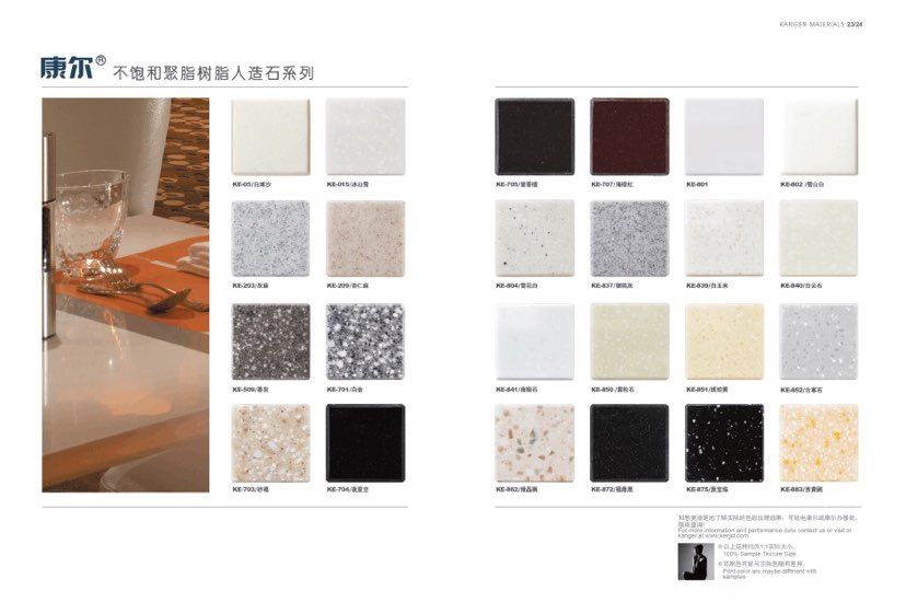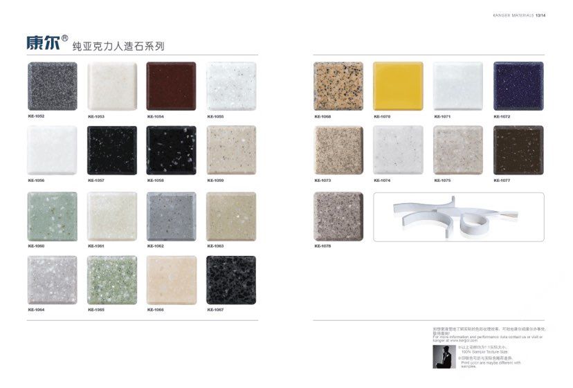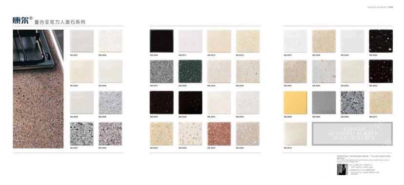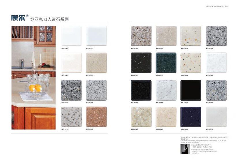 康爾人先后開發(fā)出了色彩豐富的 100% 純亞克力系列,復合亞克力系列,不飽和樹脂系列,石英石、集成成品臺面和高分子復合材料門板系列。產(chǎn)品系列多樣、顏色豐富、品質穩(wěn)定、已銷往世界幾十個國家,深受國內(nèi)外客戶的好評.