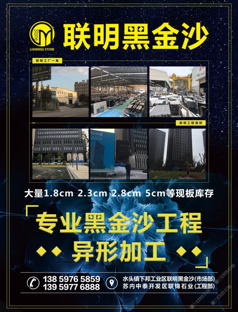 【聯(lián)明?黑金沙】——大工廠的規(guī)模和質(zhì)量,小廠的價(jià)格。兩工廠共占地35左右畝地,一廠為市場(chǎng)部位于水頭鎮(zhèn)下邦工業(yè)區(qū),二廠為工程運(yùn)營中心位于石井中泰集控區(qū),是一家集礦山、生產(chǎn)、加工為一體化的綜合性專業(yè)化石材工廠,有著十幾年的黑金沙經(jīng)驗(yàn),公司主要經(jīng)營黑金沙市場(chǎng)板,工程板,黑金沙異型加工。工程案例有:1、上海楊浦區(qū)149項(xiàng)目中船大廈,黑金沙總用量3萬平方;2、蒼南天和家園共3期,黑金沙總用量5萬平方;