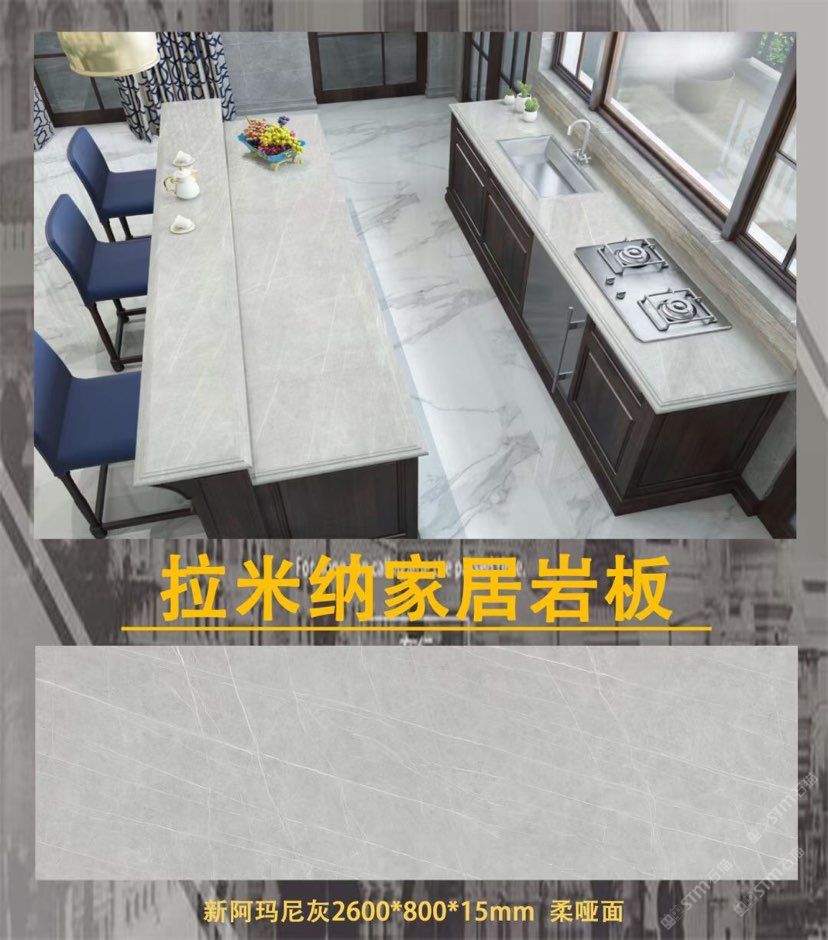 新品種:巖板,硬度坑比石英石,亮度高,耐磨耐刮,防火防高溫,零滲透極耐污,超耐腐蝕,無毒無輻射。