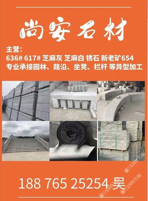 主營;新老礦芝麻黑 芝麻灰 芝麻白 銹石 636 617 專業(yè)承接 園林地鋪、路沿石、坐凳.欄桿 自然面、菠蘿面、蘑菇石、外墻干掛等異形 厚板加工