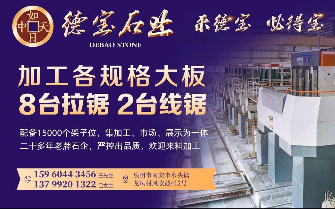 德寶大理石專業(yè)加工各規(guī)格大板,8臺拉鋸2臺線鋸,配備15000個架子位,是一家集加工、市場、展示為一體的二十多年老牌石企,嚴(yán)控出品質(zhì),歡迎來料加工!