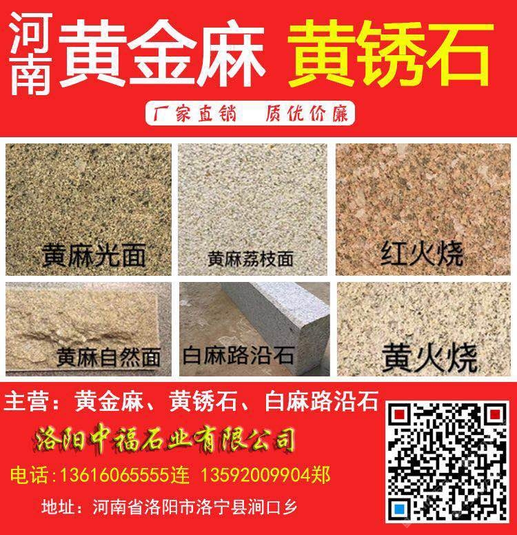 洛陽中福石業(yè)(電話:13616065555連17036286666連13592009904鄭)是河南黃金麻、河南黃銹石、河南白麻、河南芝麻白、角美銹、龍海銹、漳浦銹、g682石材、g682花崗巖、黃金麻花崗巖、黃金麻石材、黃色石材、黃色花崗巖、荒料、路沿石、墓碑石、工程面板、異型加工、芝麻黑廠家、花崗巖石材、幕墻石材、干掛板、馬路牙子、水溝蓋板、花圍樹圍、荔枝面、火燒面、磨光面花崗巖板材等產(chǎn)品專業(yè)生產(chǎn)加工的工廠,擁有完整、科學(xué)的質(zhì)量管理體系。洛陽中福石業(yè)有限公司的誠信、實(shí)力和產(chǎn)品質(zhì)量獲得業(yè)界的認(rèn)可。歡迎各界朋友蒞臨參觀、指導(dǎo)和業(yè)務(wù)洽談。河南黃麻光面河南黃麻荔枝面河南紅火燒河南黃麻自然面河南白麻路沿石/道牙石/路緣石/路側(cè)石/鋪路石/路邊石河南黃火燒面河南黃金麻河南黃銹石/河南黃金鉆石材/河南芝麻白/河南白色花崗巖/河南白色石材/河南黃色石材/河南黃色花崗巖
