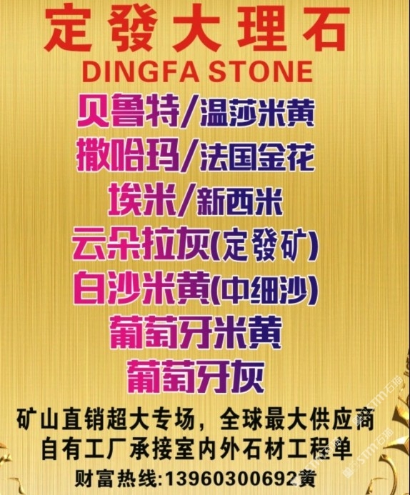 發(fā)布信息: 貝魯特/溫莎米黃,工程外墻干掛? 葡萄牙米黃/葡米,工程外墻干掛★ 撒哈瑪/法國金花,室內(nèi)外材料?? 埃米、新西米,超白低室內(nèi)外材料★ 云朵拉灰,專為工程而打造,超性價比 白沙米黃/中細沙,室內(nèi)外材料?? 令每個工程交付,做到驗收無憂???? (質(zhì)與量的保障者、經(jīng)得起層層考驗)???? 全球供應商,各大地產(chǎn)指定供應商? 承接國內(nèi)外室內(nèi)外石材工程訂單???? 致富專線:13960300692黃