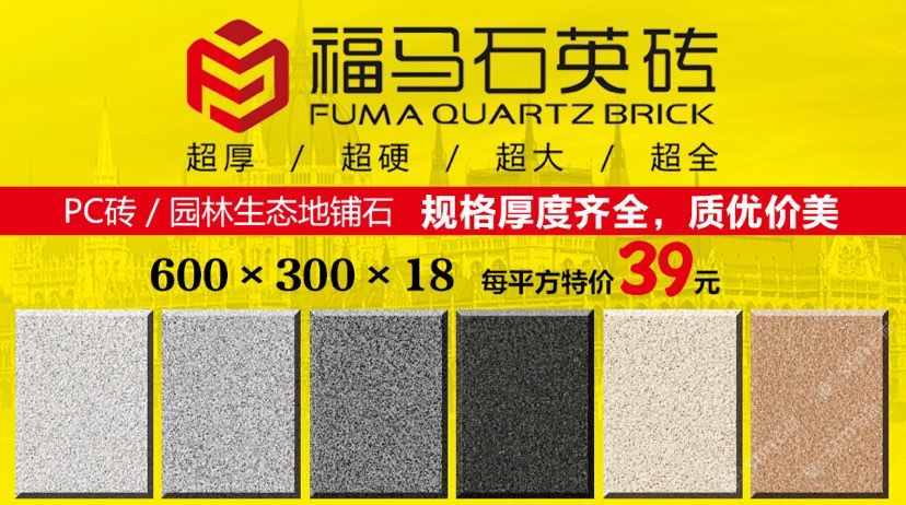 發(fā)布信息: ??福馬石英磚 強(qiáng)勢推出多種規(guī)格與厚度,并有荔枝面、火燒面、自然面等不同表面處理工藝的石英磚/PC磚產(chǎn)品;產(chǎn)品具有色彩艷麗、光潔度高、顏色均勻,抗壓耐磨、韌性好、致密度高、堅(jiān)固耐用、比重輕、超低吸水率、防污防滲、耐侵蝕風(fēng)化、不褪色、放射性低等優(yōu)點(diǎn),是園林地鋪及外墻干掛的一類裝飾材料。