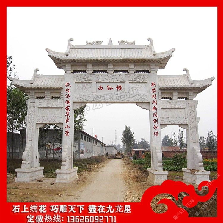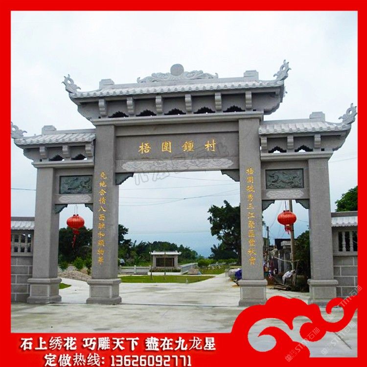 發(fā)布信息: 石牌坊制做廠家 鄉(xiāng)村牌坊大門效果圖大全賞析——九龍星石業(yè)。 鄉(xiāng)村牌坊大門效果圖具有相當高的實用性的,從建筑的美觀上石牌坊是一個建筑的 代言,從文化上石牌坊是一個區(qū)域或一個地域或一個民族的文化修養(yǎng)代言,在使用性 上從小的來說石牌坊可以做一個院落的大門,可以是一個街和它文化的開端。 石牌坊制做廠家在制作上其用料的選擇是非常講究的,在雕刻制作時也是要 求的比較的精致。而且美麗鄉(xiāng)村入口牌坊上都混雕刻有圖案和文字有著深厚的文化以 及當?shù)氐拿耧L(fēng)民俗。在村指引牌坊圖片的制作過程中,每一座石牌坊都會采用陰刻、 線刻、浮雕、鏤雕、雙面雕等多種不同的雕刻手法,使新農(nóng)村石牌坊在雕刻制作上的 圖案更加的生動。 鄉(xiāng)村牌坊大門在主題外觀和內(nèi)容雕刻上本身就是一種藝術(shù)的詮釋。比如在門樓 四個柱腳上制作瑞獸例如:麒麟、貔貅、瑞獅、瑞象、抱鼓等傳統(tǒng)的祥瑞圓雕雕刻。 也可以和諧的添加一些西方建筑經(jīng)典,在建筑藝術(shù)上它是不分界限的,我們在美麗鄉(xiāng) 村入口牌坊外觀的設(shè)計制作上,可以有一些和諧的改造也是體現(xiàn)提倡建造者的文化修 養(yǎng)的表現(xiàn)。