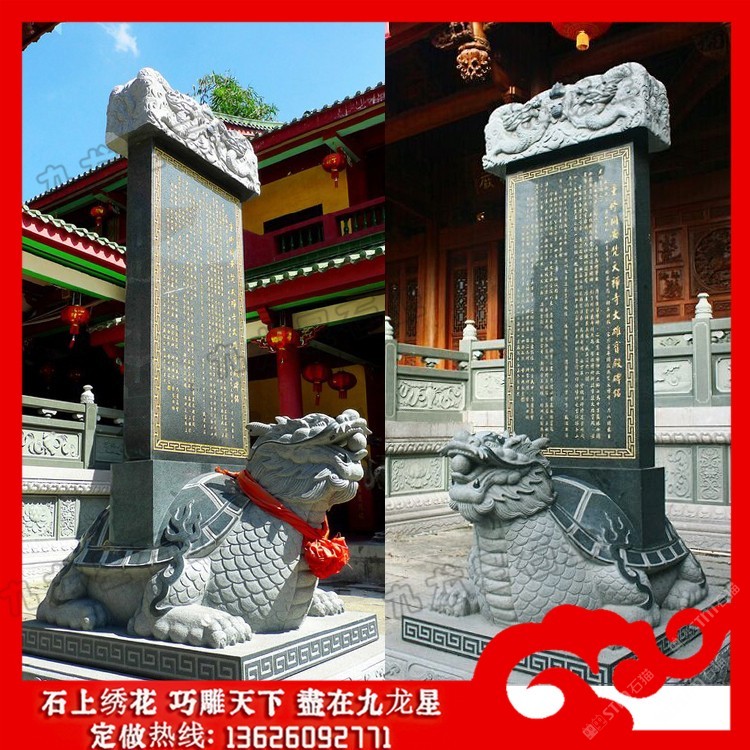 發(fā)布信息: 石雕龜馱碑?dāng)[件 龍龜馱碑圖片價格_九龍星石業(yè)。 石雕龜馱碑?dāng)[件又稱龜載碑、龍龜碑、烏龜碑、龜陀碑等。而確切的說,它應(yīng)該叫赑屃,傳說中它是龍生九子之一,力大無窮而且性格好,又善背重東西。龍龜馱碑多用于寺廟和立碑紀(jì)念,因為龜為長壽的動物,古人以此建碑,也是想保存千秋萬載,讓碑流芳萬古的寄托。 石雕龜馱碑又名霸下,形似龜,傳說為龍九子之一.是老六,螭頭龜足,平生好負(fù)重,力大無窮,碑座下的龜趺是其遺像。傳說霸下上古時代常馱著三山五岳,在江河湖海里興風(fēng)作浪。后來大禹治水時收服了它,并為治水作出了貢獻(xiàn),洪水治服了,大禹擔(dān)心它又到處撒野,便搬來頂天立地的特大石碑,上面刻上霸下治水的功跡,叫它馱著,沉重的石碑壓得它不能隨便行走。
