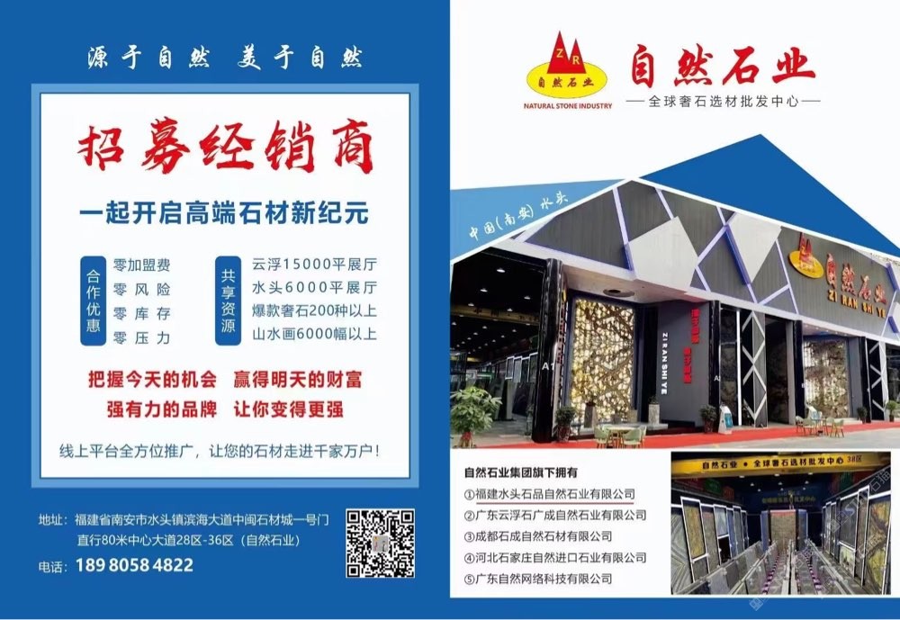 發(fā)布信息: 自然石業(yè)全球奢石批發(fā)中心,招募經(jīng)銷商,無(wú)需加盟費(fèi),一手貨源,專業(yè)背景墻供應(yīng)廠家。歡迎選購(gòu) ??19305059488(微信同號(hào)) 主營(yíng):潘多拉,新款潘多拉,藍(lán)絲綢,紅絲綢,絲綢之路,魅力人生,蒂芙尼,卡拉白,魚(yú)肚白,魚(yú)肚灰,盛世紅顏,紅寶石,石榴紅寶,桃李春風(fēng),金枝玉葉。金玉滿堂,金孔雀,孔雀開(kāi)屏,火樹(shù)銀花,潘多拉,維也納,亞馬遜綠,綠翡翠,加雅綠,白色羅馬,藍(lán)色羅馬,羅馬印象,海納百川,春山畫(huà)境,冰河世紀(jì),波光靈動(dòng),金戈壁玉,天澤玉石,鉑金鉆,翰墨白金,景泰藍(lán),皇家藍(lán),白銀狐,雪山銀狐,雪山蘭,雪山藍(lán),雪山白,山水畫(huà),煙影流香,藍(lán)水晶,紫水晶,加爾達(dá)之晶,龍文綠,竹節(jié)綠,綠斑竹,紫氣東來(lái),千里馬,藍(lán)色精靈,壁山芳華,格蘭云天,香格里拉,夢(mèng)幻藍(lán)寶,海洋之星,綠野仙蹤,藍(lán)翡翠,自然白,羅馬灰,白底潘多拉等產(chǎn)品!有單你來(lái)談,價(jià)格好商量! 中閩石材城28區(qū)-36區(qū)(一號(hào)門直走一百米左手邊)