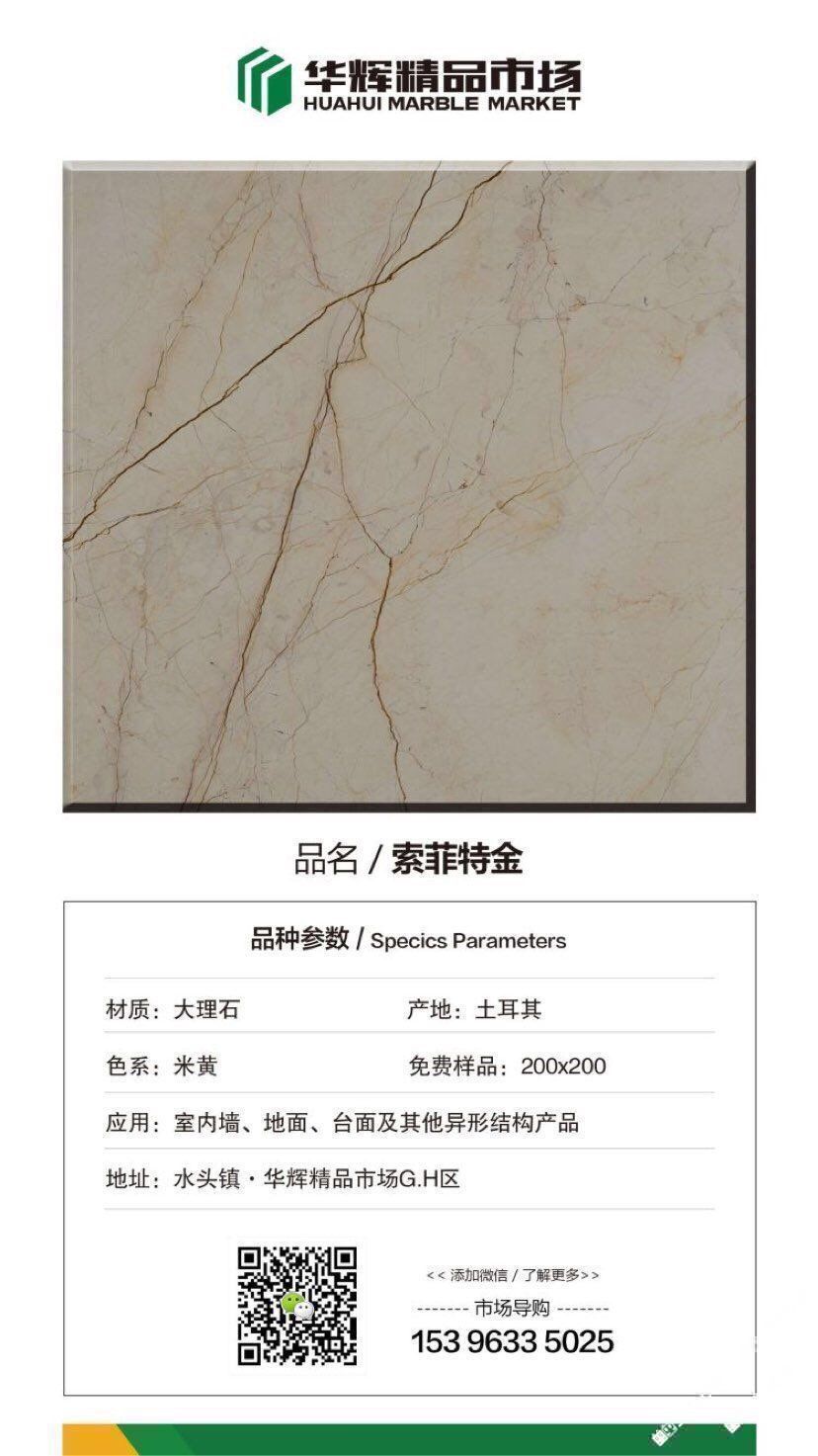 發(fā)布信息: 【華輝精品市場(chǎng)-昌福石業(yè)】 推薦:索菲特金 索菲特金源自于土耳其經(jīng)典石材,不規(guī)則的金黃色線(xiàn)條如行云流水般浮游于底色之上,打破了原有的平靜和單調(diào),淺黃的底色能更好的表現(xiàn)出天然大理石的風(fēng)韻。?適用于酒店、工程等墻面地面的鋪貼。 導(dǎo)購(gòu)電話(huà):153 9633 5025