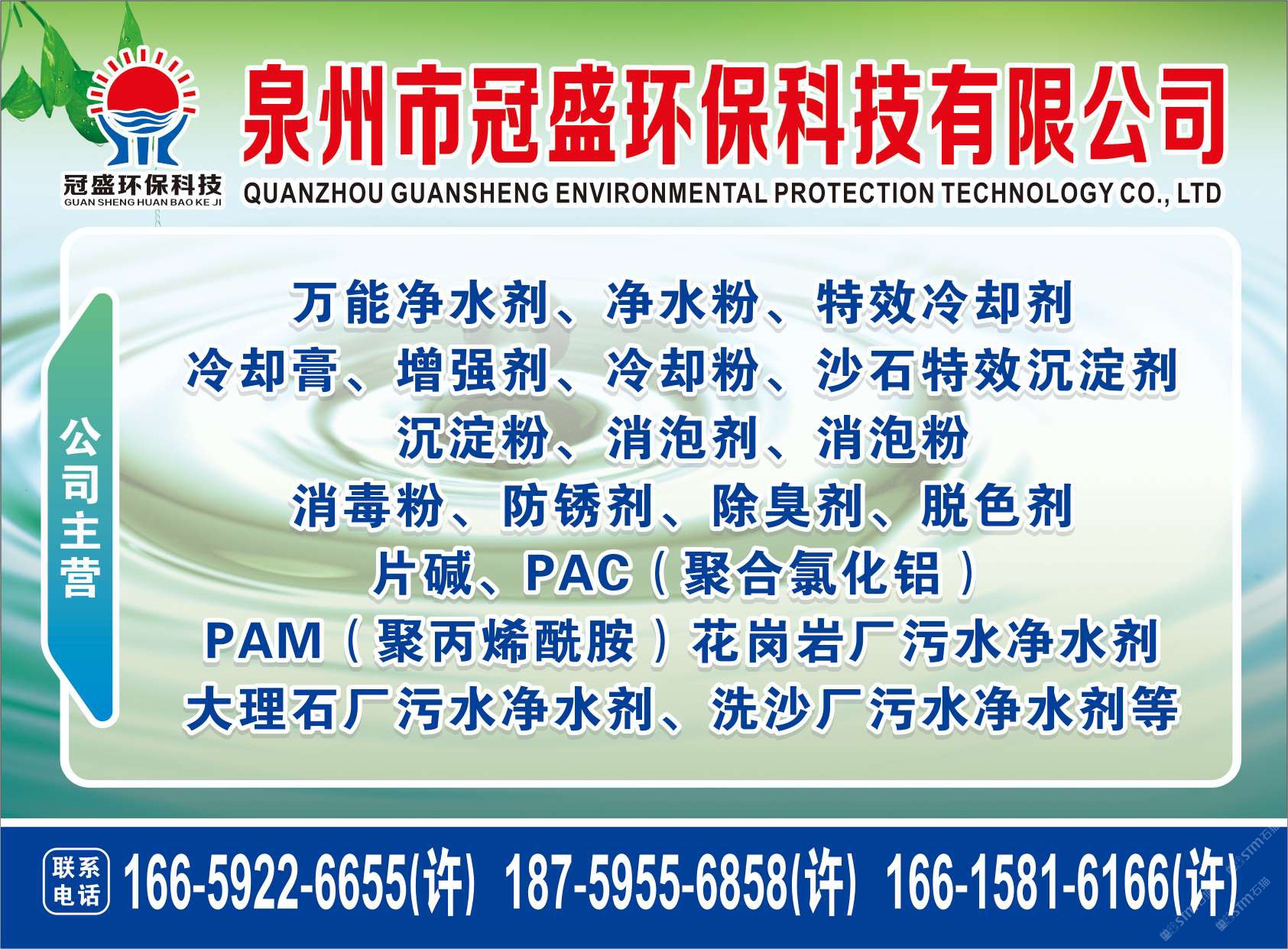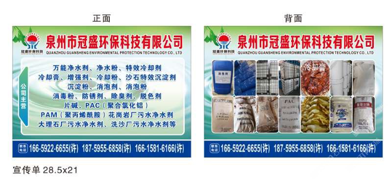 發(fā)布信息: 冠盛環(huán)??萍?8759556858 主營產(chǎn)品:凈水劑,冷卻劑,冷卻粉,大理石人造石專用凈水劑,沉淀粉,消泡劑,消毒凈水劑,防銹凈水劑,除銹劑,除臭劑,聚丙烯酰胺,聚合氯化鋁,鹵精,洗沙專用凈水劑,壓濾機專用凈水劑,陶瓷廠專用凈水劑(黃藥 白藥)等所有水處理環(huán)保材料……