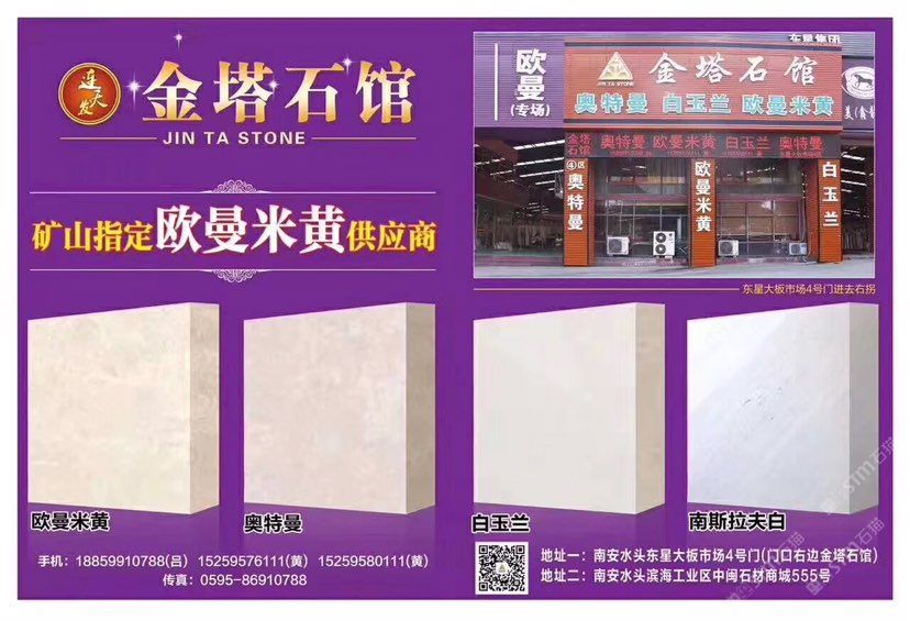 金塔石業(yè) 聯(lián)系人:呂先生    188****0788 查看 手機號碼:無 主營范圍: 大板批發(fā)、荒料、大理石加工、石材外貿(mào)、 企業(yè)地址:福建南安水頭鎮(zhèn)東星大板市場5號門A(3a)