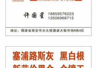 豪旭建材有限公司主營產(chǎn)品:塞浦路斯灰1,魚肚灰,翡翠白玉,比薩灰1,比薩灰2,比薩灰(國產(chǎn)),特普灰(正礦),特普灰,云多拉灰,云多拉灰13,云多拉灰2企業(yè)地址:福建泉州南安市水頭鎮(zhèn)澳盛市場(chǎng)8棟4區(qū)