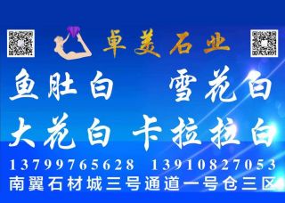 南安市水頭鎮(zhèn)卓美石材主營(yíng)產(chǎn)品:魚肚白,魚肚白1,雪花白,雪花白2,雪花白3,卡拉拉白,卡拉拉白1,卡拉拉白3,中花白(細(xì)花),魚肚白大板,魚肚白(灰黑紋),魚肚白小板企業(yè)地址:福建泉州南安市水頭鎮(zhèn)東升3通道D1-1