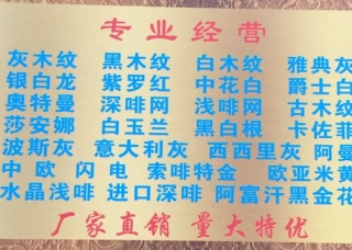 隆川石業(yè)主營產(chǎn)品:月亮云灰,布朗啡,威尼斯金,云多拉灰12,范特西,冰川灰3,博斯高灰,瑪雅灰,黃金灰,雅仕灰,薩凡藍(lán),巴拿馬木紋,日出印象,藍(lán)木紋2,云朵拉灰,藍(lán)木紋,格陵蘭灰,麥卡灰,薩凡藍(lán)1,圣托里尼灰,云朵拉灰4,保加利亞灰,宇宙星云(仿古),宇宙星云(光面),宇宙星云,海洋化石,墨韻,西西里灰,奧特曼灰,綠野仙蹤,城堡灰,索菲特金,尼泊爾灰,布拉格灰,奧斯汀灰,巴菲特,翠谷幽蘭,奧巴馬木紋,紫山水,菲拉格慕1,范思哲黑,鴻蒙黑,范思哲,卡拉拉白,中花白1,45度灰,金磚灰,英倫灰(意大利),普拉達(dá)綠,孔雀綠(青龍石),古典錫耶納,落葉松(布拉格),落葉松,星耀灰(意大利礦),鵝毛灰,印尼灰,卡賓灰企業(yè)地址:福建南安水頭鎮(zhèn)海西石材城海西五路D12